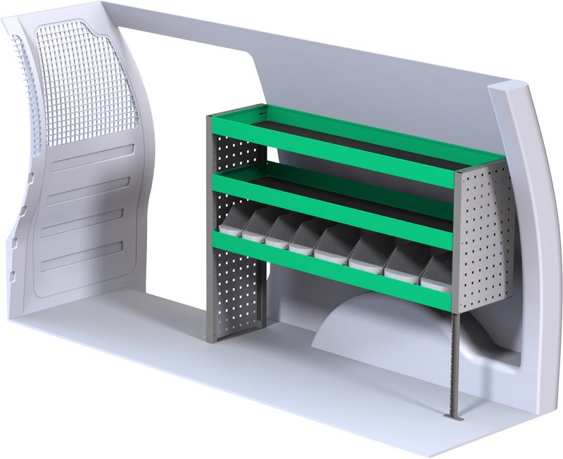 Aménagement intérieur Volkswagen Caddy Maxi. Existe en plusieurs configurations possibles: étagères simples ou avec façades rabattables, avec casiers ou sans casiers et possibilité d'avoir sur certaines versions, un plancher aménagé. Aménagement différent côté droit et côté gauche. Peut être extractible horizontal ou vertical, nous consulter.