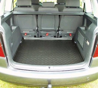 Fond de coffre VOLKSWAGEN Touran version 5 places, sans plancher variable, après 07/10 : Protection amovible moulée dans un plastique mi-souple gris.